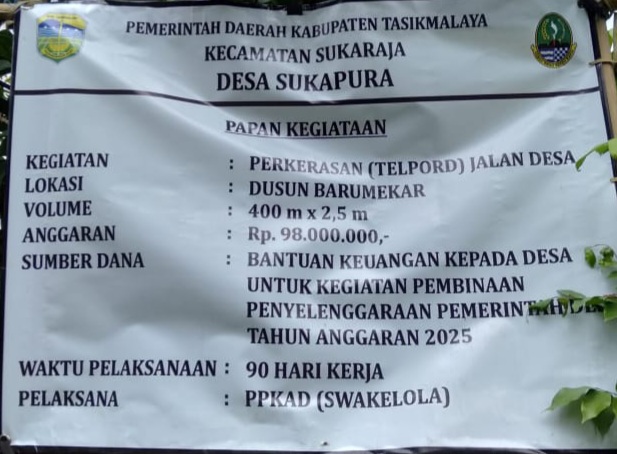 TentaraPolisi.id – Perkerasan Jalan Desa atau Telpord yang dilaksanakan secara swakelola di salah satu Kecamatan yang berada di Kabupaten Tasikmalaya, tepatnya di Jalan Cihanya Dusun Barumekar RT 27 RW 09 Desa Sukapura Kecamatan Sukaraja.