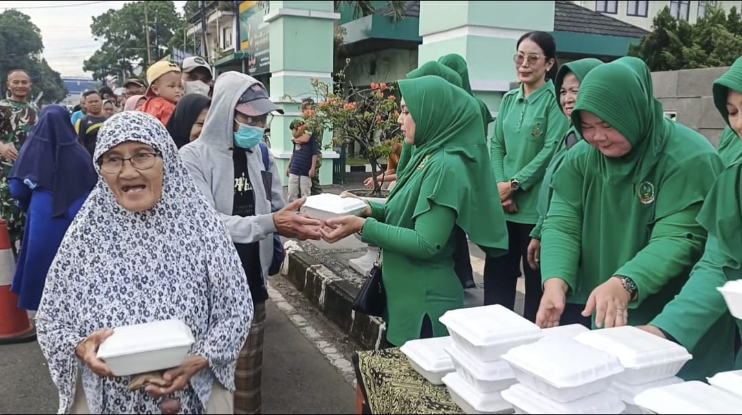 Ketua Persit KCK Cabang XXIII Kodim 0612/Tasikmalaya, Ny. Rima Imvan Ibrahim, S.Sos., bersama jajaran pengurus turun langsung membagikan nasi box untuk berbuka puasa. Kegiatan ini menjadi bagian dari “Jumat Berkah” yang rutin digelorakan sebagai wujud nyata kepedulian sosial.