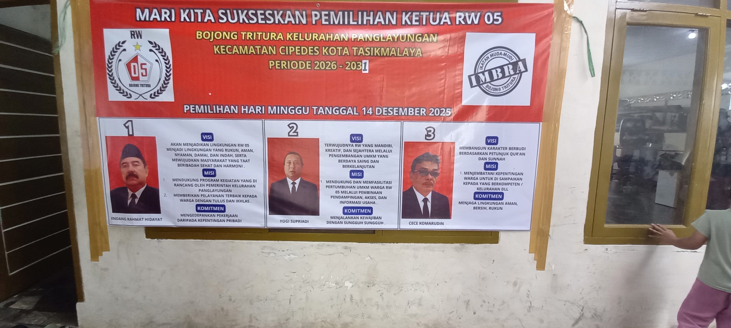 TENTARAPOLISI.ID – Dalam rangka menjaga stabilitas keamanan dan ketertiban di wilayahnya, warga RW 005 Bojong Tritura Kelurahan Panglayungan Kecamatan Cipedes Kota Tasikmalaya laksanaan pemilihan Ketua RW 005 pada hari Minggu, 14 Desember 2025. Kegiatan ini berlangsung sejak pukul 08.30 WIB hingga 14.00 WIB, yang berlokasi di Madrasah Al Barokah.