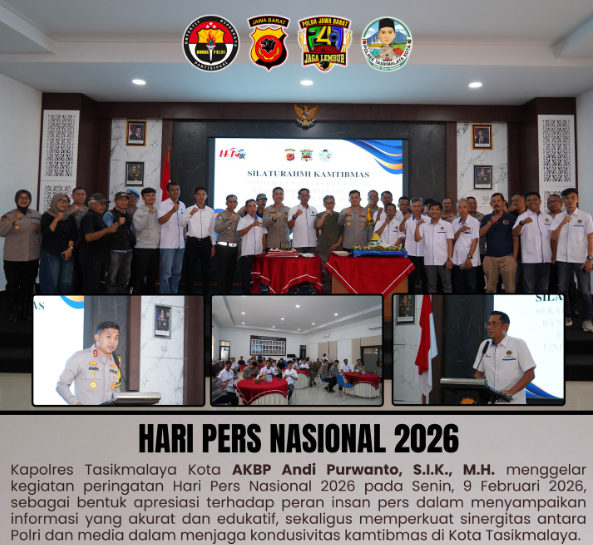 Polres Tasikmalaya Kota – Kapolres Tasikmalaya Kota AKBP Andi Purwanto, S.I.K., M.H. beserta Pejabat Utama Polres Tasikmalaya Kota melaksanakan kegiatan Peringatan Hari Pers Nasional (HPN) yang bertempat di Aula Polres Tasikmalaya Kota, pada Senin pagi, 9 Februari 2026.