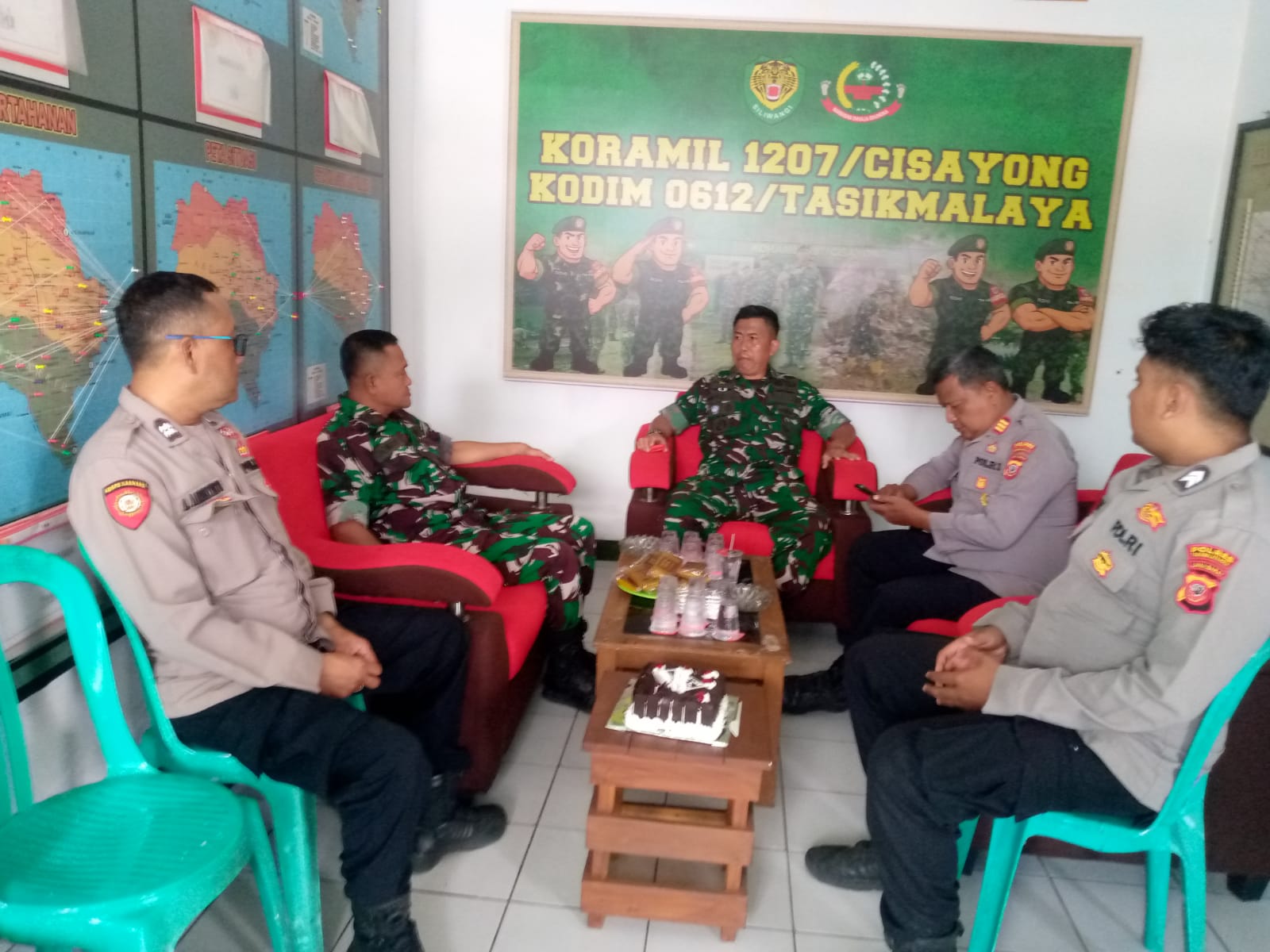 tentarapolisi.id, Kota Tasikmalay– Dalam rangka memperingati Hari Ulang Tahun (HUT) ke-80 Tentara Nasional Indonesia (TNI), Kapolsek Sukaratu Polres Tasikmalaya Kota AKP Dede Tarman bersama anggota melaksanakan kunjungan silaturahmi ke Koramil Cisayong, Senin (6/10/2025).