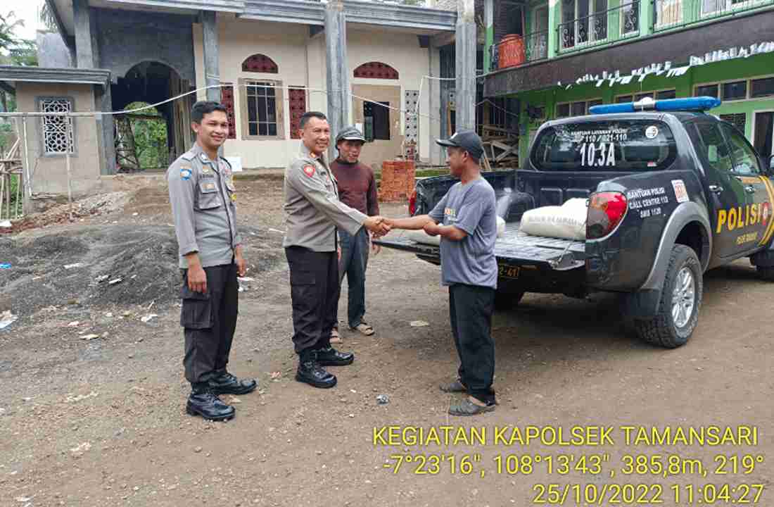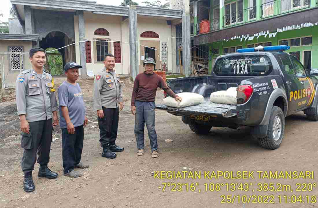 TENTARAPOLISI.ID — TASKOT—Kapolsek Tamansari AKP Nurozi didampingi Bhabinkamtibmas Kelurahan Setiamulya BRIGPOL Ardi menyerahkan bantuan semen untuk pembangunan DKM Al Kautsar di Kampung Sindangsari Kelurahan Setiamulya Kecamatan Tamansari Kota Tasikmalaya, Selasa (25/10/22)