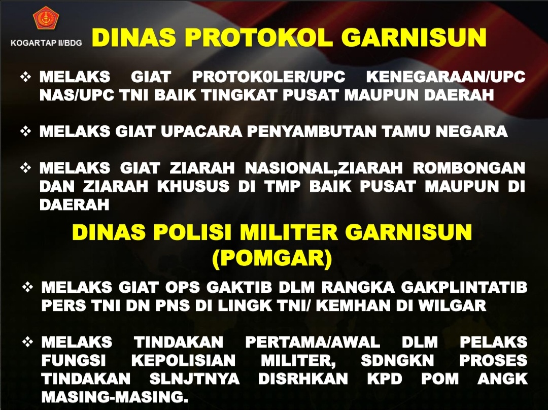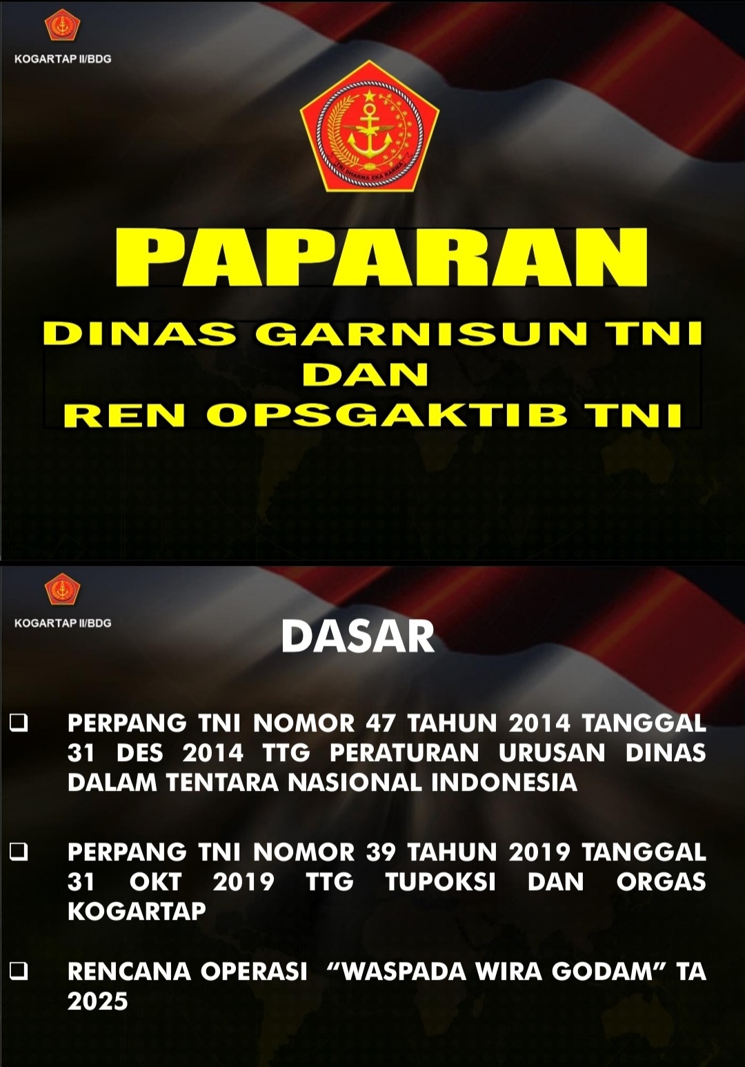 Paparan Dinas Garnisun TNI dan Ren Opsgaktib TNIAdmin Sku TPDesember 20, 2025TNI27 Dilihat Post Views: 27 WhatsApp Facebook 0 Twitter 0 LinkedIn 0Shares Jangan lewatkanSUBGAR 0612 Tasikmalaya Tertibkan Rumah Kost Dan Tempat Hiburan MalamGARNISUN 0612 KOTA TASIKMALAYA Gelar Operasi Gabungan Penertiban Surat Kendaraan BermotorDonor Darah di Kodim 0612/Tasikmalaya : Bakti Teritorial TNI untuk Kemanusiaan di HUT ke 80Jaga Stabilitas Pertahanan dan Keamanan di Kota Tasikmalaya, Kominda dan TNI Ajak Ormas Islam Cegah RadikalismePeduli Sesama, Dandim 0612/Tasikmalaya dan Persit KCK Cabang XXIII salurkan Bantuan untuk Korban Banjir di TanjungsariDandim 0612/Tasikmalaya Laksanakan Monitoting Pendistribusian Perdana Program Makan Sehat Bergizi Gratis di SDN 2 TenjonagaraSemarak Open Turnamen Bulutangkis Danrem 062/Tn Cup II Se Jawa BaratTNI hadir dengan Cinta : Dandim 0612/Tasikmalaya Kunjungi Panti Jompo Welas Asih, Tebar Kepedulian dan Kasih SayangPangdam III/Slw Sambut Kunker Menhan RI di Secata