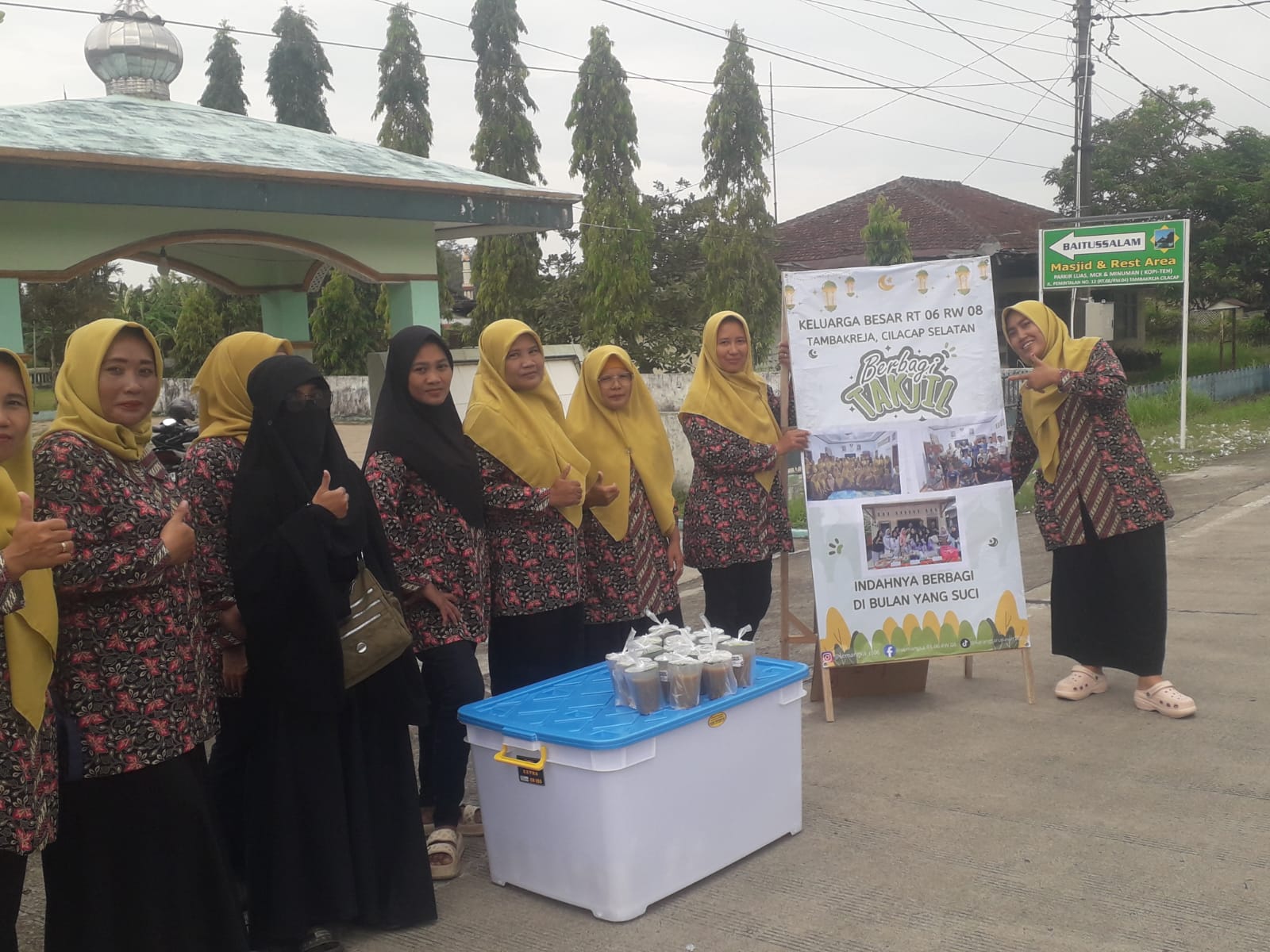 Pantauan di lokasi menunjukkan antusiasme para ibu-ibu anggota RT 06 RW 08 yang kompak mengenakan seragam batik motif bunga dipadu kerudung kuning. Dengan ramah, mereka membagikan paket takjil berupa minuman segar yang telah disiapkan dalam wadah kontainer besar.